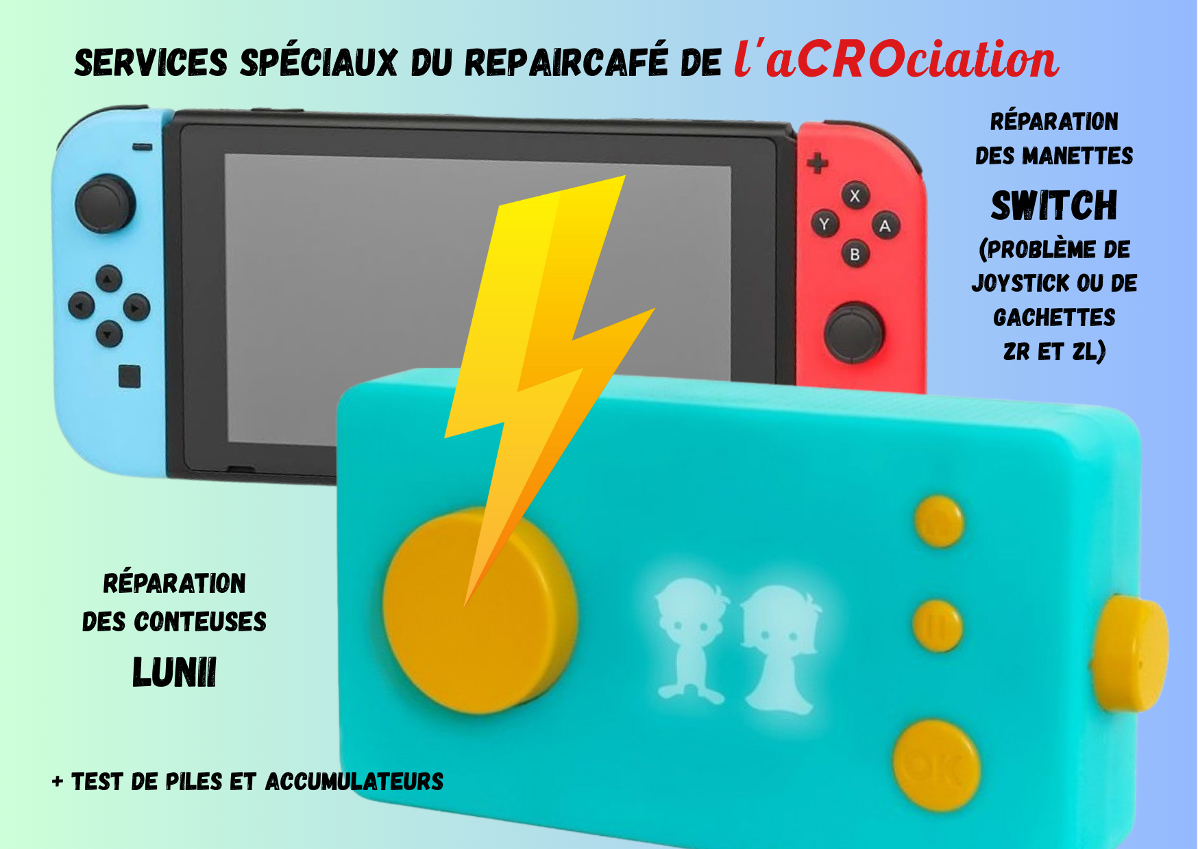 Vous sont aussi proposés nos services spéciaux : la réparation des manettes SWITCH et des conteuses Lunii